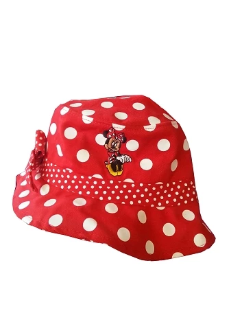 Protect your Princess from the sun with this Minnie Mouse sun hat. Features Minnie posing as pretty as ever on the front, surrounded in polka dots, and bow on the side.