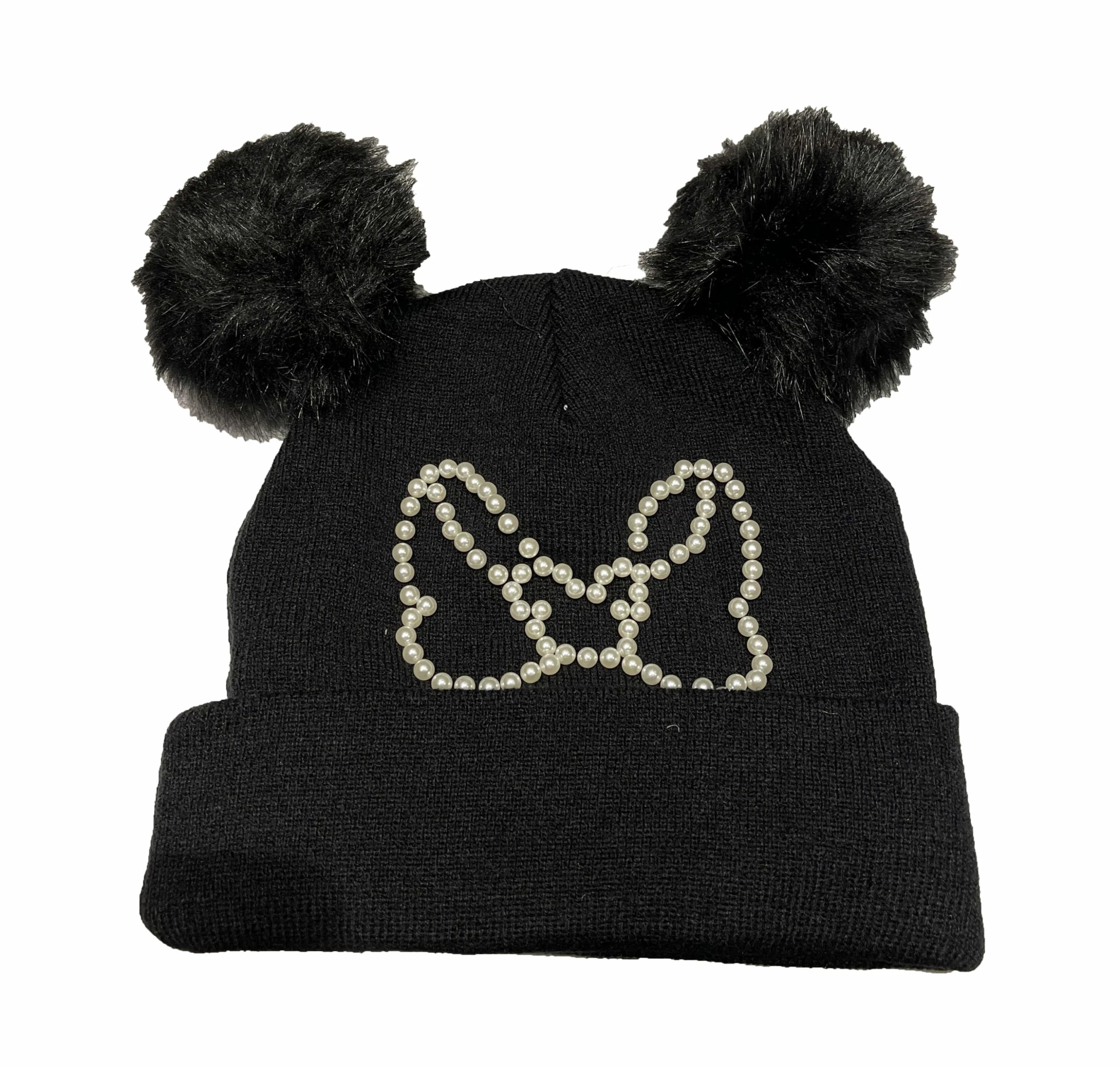 Add some warmth this winter with this black Minnie Mouse Pop Pom Knit Hat. Featuring Minnie Mouse with Pom Poms on top, with beaded bow.